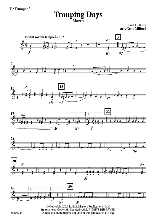 Digital Sheet Music for Trouping Days - Bb Trumpet 3 by Gene Milford, Karl King scored for Concert Band; id:504584