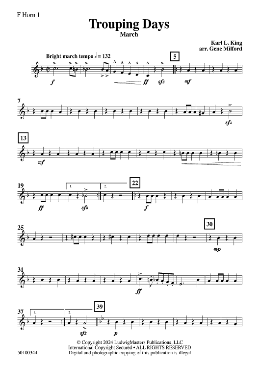Digital Sheet Music for Trouping Days - F Horn 1 by Gene Milford, Karl King scored for Concert Band; id:504585