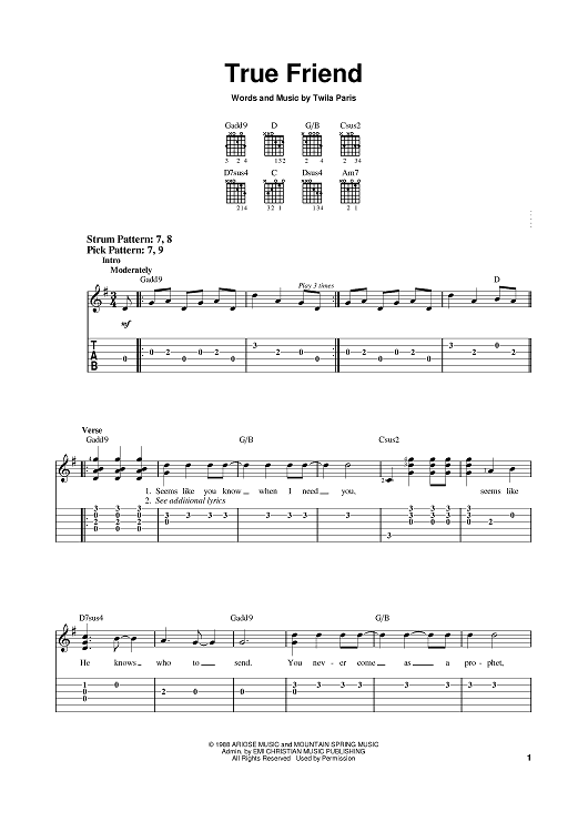 Digital Sheet Music for True Friend by Twila Paris scored for Easy Guitar; id:372571