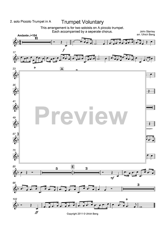 Digital Sheet Music for Trumpet Voluntary - 2nd Solo Piccolo Trumpet in A by , John Stanley, Ulrich Bang scored for Brass Ensemble; id:419941