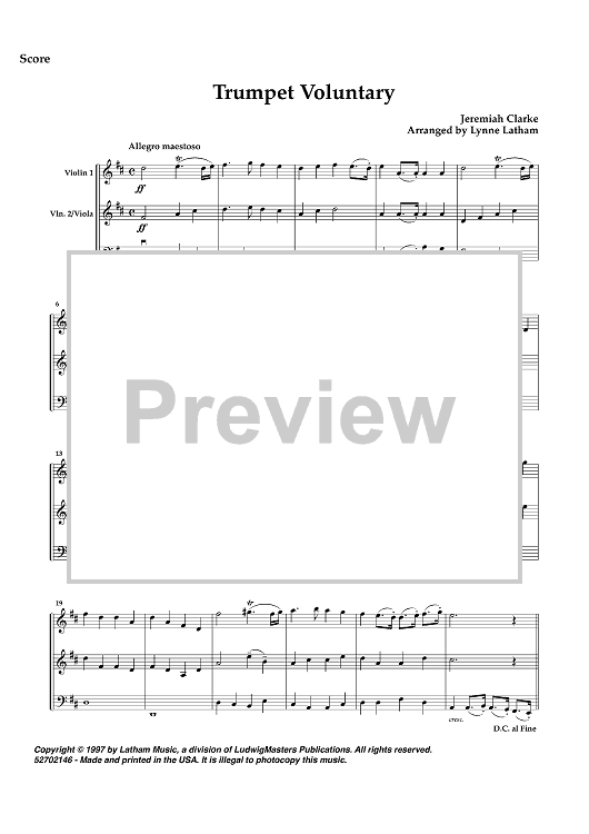 Digital Sheet Music for Trumpet Voluntary - Score by Jeremiah Clarke, Lynne Latham scored for String Trio; id:450118