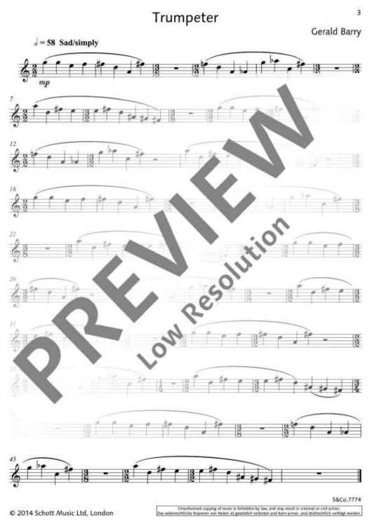 A trumpeter is a cavalry or artillery soldier who gives signals with a trumpet. (Gerald Barry, 1998)This piece may be performed on any of the following instruments in different transpositions. If played by a string instrument, there should be no vibrato. It may be played by Flute, Alto Flute, Bass Flute, Piccolo, Oboe, Cor Anglais, Clarinet, Basset Clarinet, Bass Clarinet, Bassoon, Contrabassoon, Trumpet, Horn, Trombone, Tuba, any other Brass Band instrument, Mouth Organ, Ondes Martenot, Concertina, Bagpipes, Tubular Bells, Violin, Viola, Cello, Double Bass.In thinking of the register in which to play it, thought should be given to the drama and colour of the instrument involved. For example, if it were played by a Contrabassoon, the version in this edition should be transposed down two octaves and a minor 6th, so that the lowest note in the melody is B flat, the lowest note on the Contrabassoon.