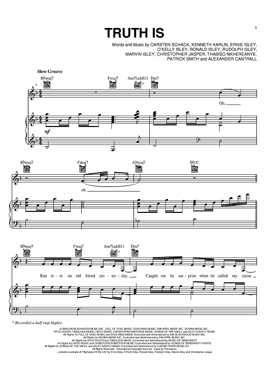 Digital Sheet Music for Truth Is by O'Kelly Isley, Jr., Ronald Isley, Rudolph Bernard Isley, Carsten Schack, Kenneth Karlin, Fantasia, Ernie Isley, Marvin Isley, Alex Cantrell, Chris Jasper, Patrick Smith scored for Piano/Vocal/Chords; id:382164