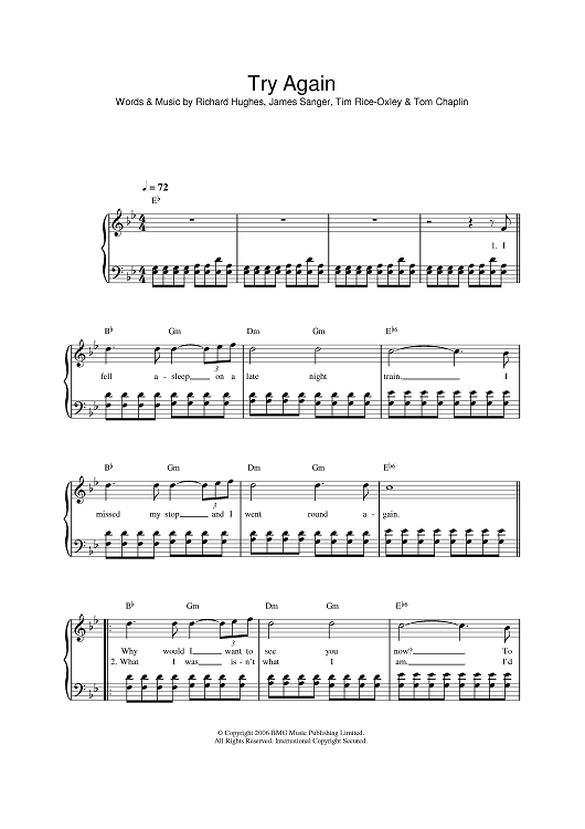 Digital Sheet Music for Try Again by Keane, Tim Rice-Oxley, Tom Chaplin, Richard David Hughes, James Sanger scored for Piano/Vocal/Chords; id:393207