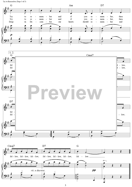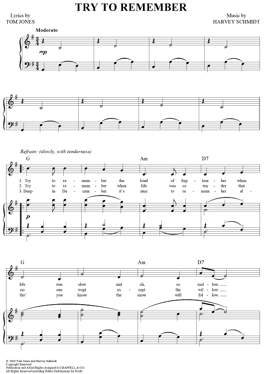 Digital Sheet Music for Try to Remember by Tom Jones, Harvey Schmidt scored for Piano/Vocal/Chords; id:304239
