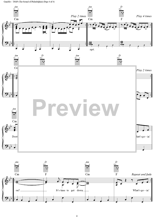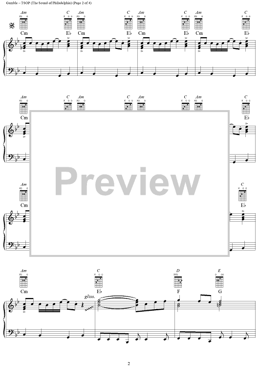 Digital Sheet Music for TSOP (The Sound of Philadelphia) by Leon Huff, Kenneth Gamble, MFSB featuring the Three Degrees scored for Piano/Vocal/Chords; id:297073
