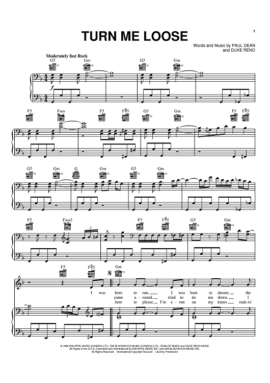 Digital Sheet Music for Turn Me Loose by Paul Dean, Loverboy, Duke Reno scored for Piano/Vocal/Chords; id:367789