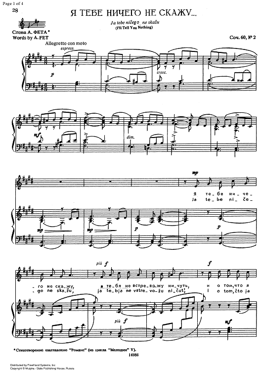 "Twelve Romances. No. 2. I'll Tell You Nothing" Sheet Music by Peter Ilyich Tchaikovsky