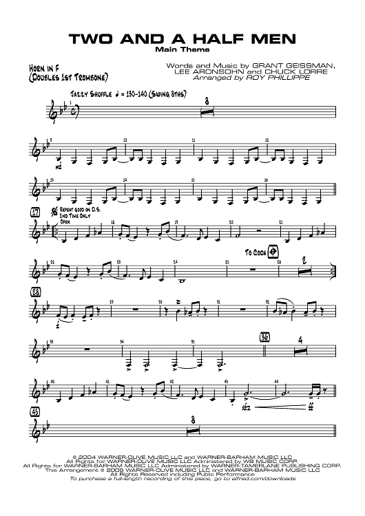 Digital Sheet Music for Two and a Half Men - Horn in F by Roy Phillippe, Grant Geissman, Lee Aronsohn, Chuck Lorre scored for Jazz Ensemble; id:359726