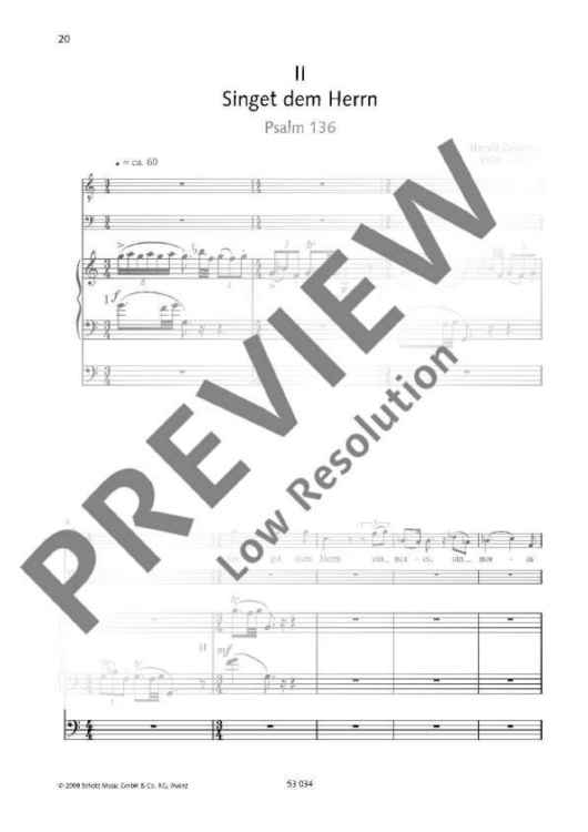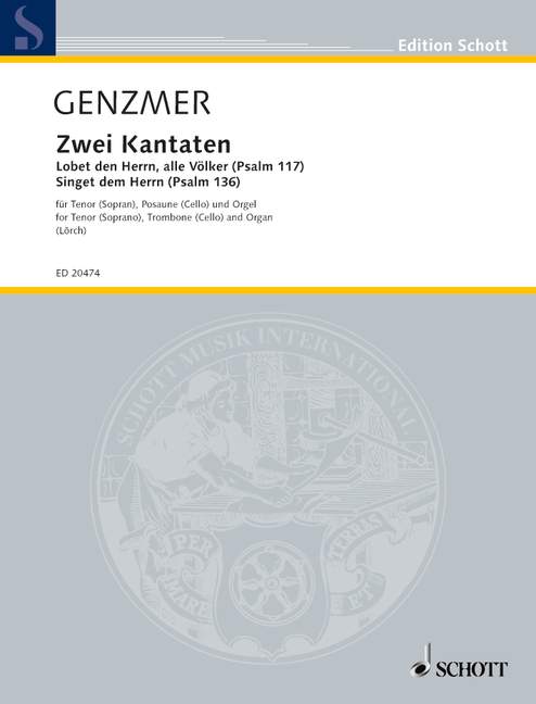 Harald Genzmer (1909-2007) schrieb in seinen letzten Lebensjahren mehrere geistliche Solokantaten und leistete damit wichtige musikalische Beiträge für die Liturgie und das geistliche Konzert. Die beiden geistlichen Solokantaten "Lobet den Herren, alle Völker" (Psalm 117) und "Singet dem Herrn ein neues Lied" (Psalm 136) verwenden zwei beliebte Psalmtexte, die im Laufe der Musikgeschichte häufig Grundlage von Kantaten und Motetten waren. Genzmer vertont die Texte in der ihm eigenen, instrumentengerechten Art, deutet den Inhalt sensibel und klangmalerisch aus und wählt eine originelle Besetzung mit Orgel und obligater Posaune (oder Violoncello). Durch ausgedehnte Vor- und Zwischenspiele für die Orgel und das Melodieinstrument haben die Kantaten einen ausgesprochen konzertanten Charakter.
