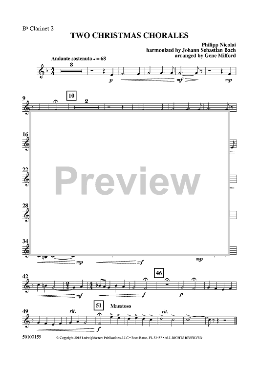 Digital Sheet Music for Two Christmas Chorales - Clarinet 2 in Bb by Philipp Nicolai, Gene Milford scored for Concert Band; id:459712
