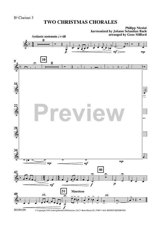 Digital Sheet Music for Two Christmas Chorales - Clarinet 3 in Bb by Johann Sebastian Bach, Gene Milford scored for Concert Band; id:459713