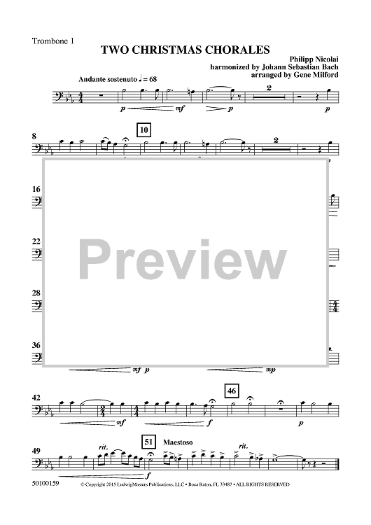 Digital Sheet Music for Two Christmas Chorales - Trombone 1 by Philipp Nicolai, Gene Milford scored for Concert Band; id:459724