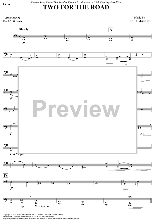 "Two For the Road - Cello" Sheet Music by Henry Mancini