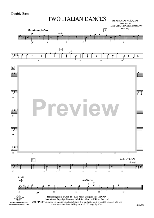 Digital Sheet Music for Two Italian Dances - Double Bass by Bernardo Pasquini, Deborah Baker Monday scored for Orchestra; id:455600