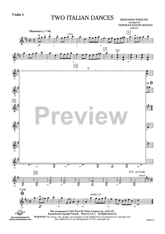 Digital Sheet Music for Two Italian Dances - Violin 1 by Bernardo Pasquini, Deborah Baker Monday scored for Orchestra; id:455595