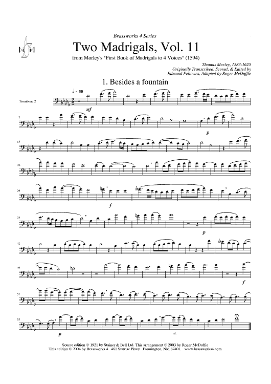 Digital Sheet Music for Two Madrigals, Vol. 11 - from Morley's "First Book of Madrigals to 4 Voices" (1594) - Trombone 2 by Thomas Morley, Roger McDuffie scored for Trombone Quartet; id:429111