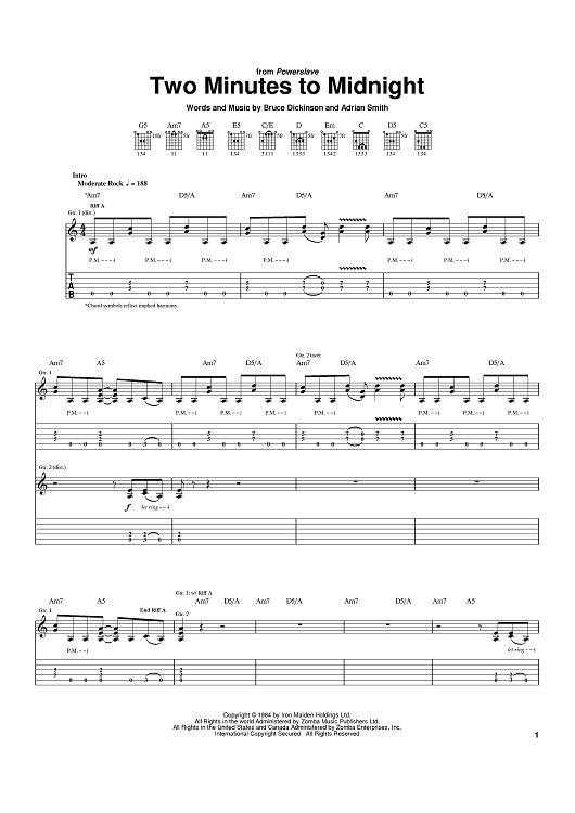 Digital Sheet Music for Two Minutes To Midnight by Bruce Dickinson, Adrian Smith, Iron Maiden scored for Guitar Tab; id:391024
