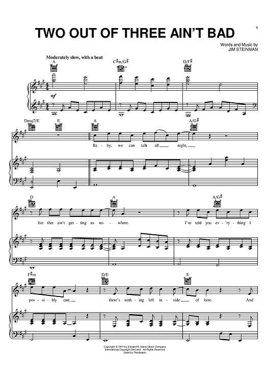 Digital Sheet Music for Two Out Of Three Ain't Bad by Jim Steinman, Meatloaf scored for Piano/Vocal/Chords; id:369059
