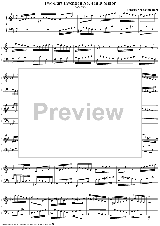 Digital Sheet Music for Two-Part Invention No. 4 in D minor by Johann Sebastian Bach scored for Piano Solo; id:94997