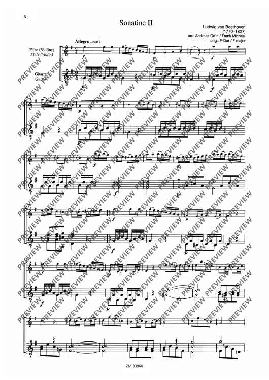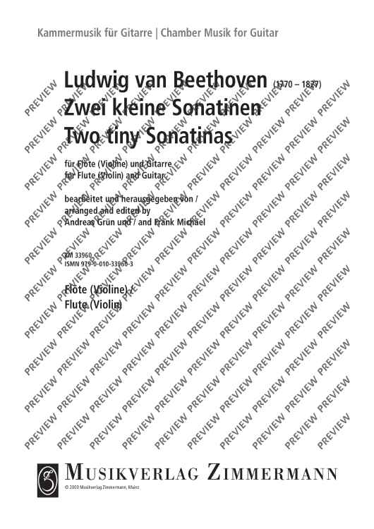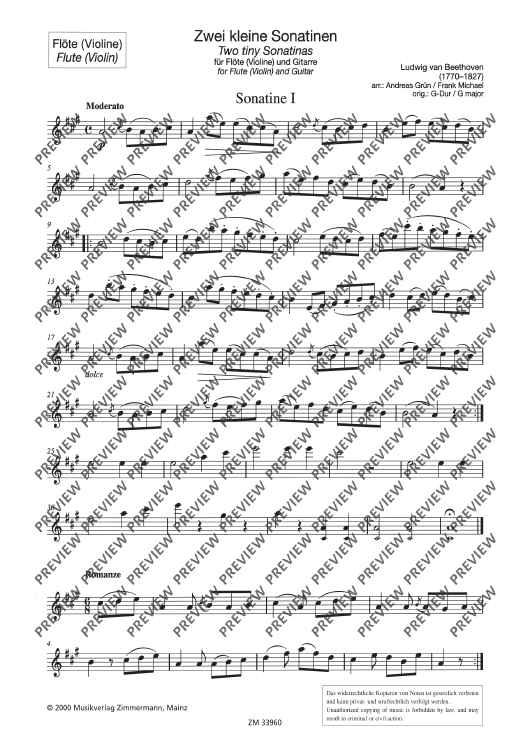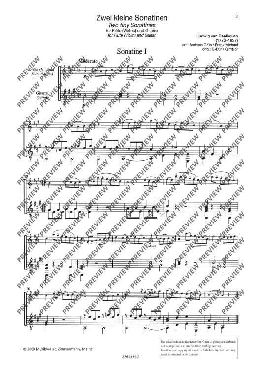 There are still doubts about whether or not the two sonatinas (originally meant for piano in G major and F major) are genuine. Due to their low level of difficulty, they are part of the standard repertoire of every piano student, and it was their popularity which brought about the arrangement presented here, mainly based on the original text.