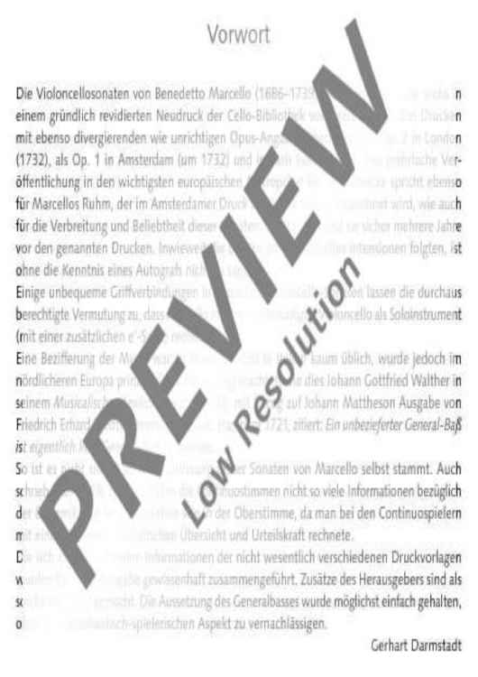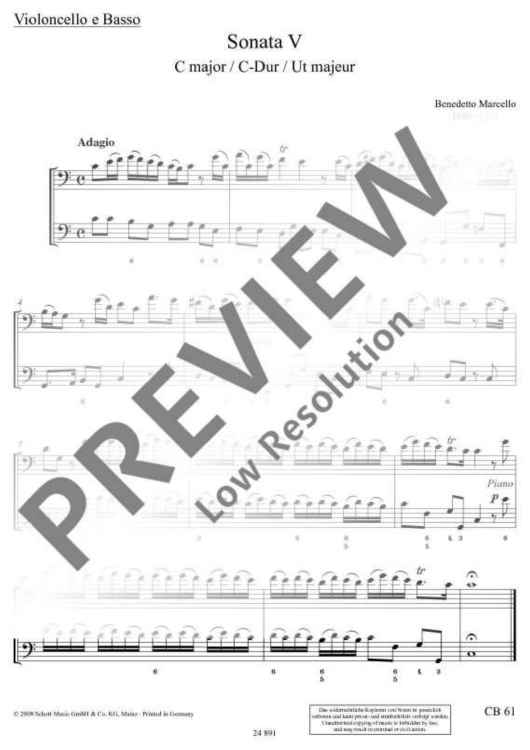 The six sonatas by Benedetto Marcello (1686-1739), apart from those by Antonio Vivaldi, are among the best-known baroque compositions for violoncello and basso continuo. During the lifetime of this composer who was actually famous then, the collection was already offered in printed editions in the major European music metropolises London, Paris and Amsterdam. Even if there is some uncomfortable fingering in these sonatas - which might be due to Marcello's working with a five-string cello with an added E' string - they are of moderate difficulty and belong to the standard works of the violoncello teaching literature. With the 4 sonatas presented here, all 6 works of the collection are now available in revised reprints (see also CB 60 and CB 104).