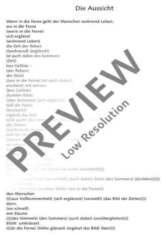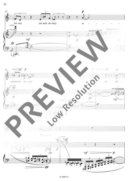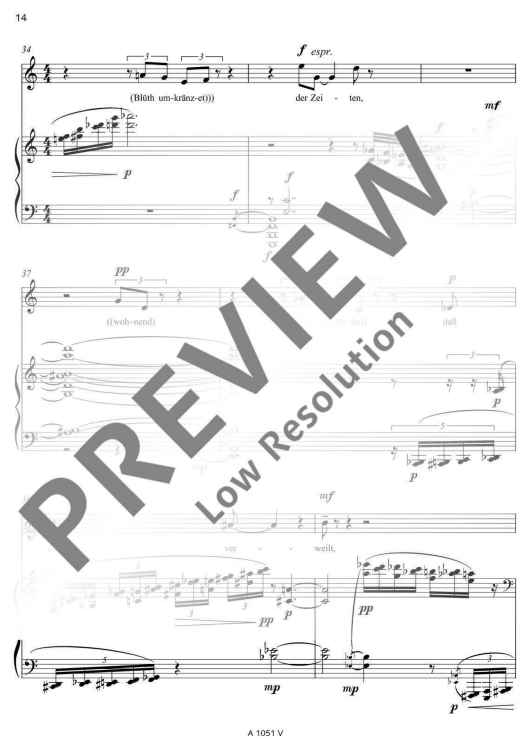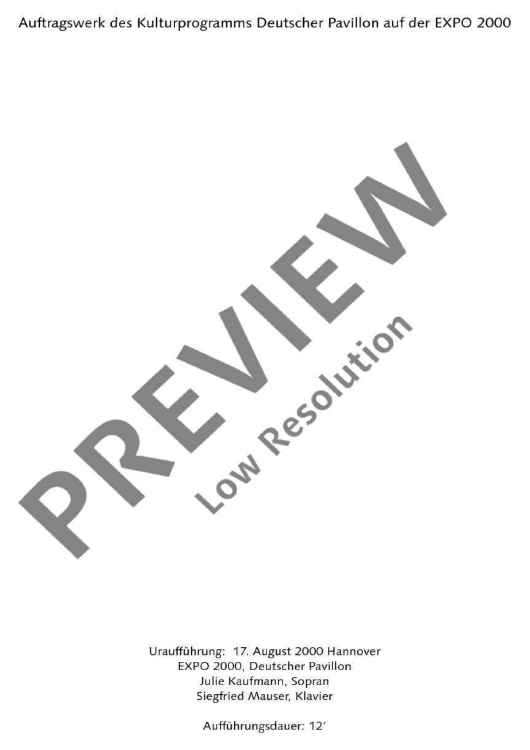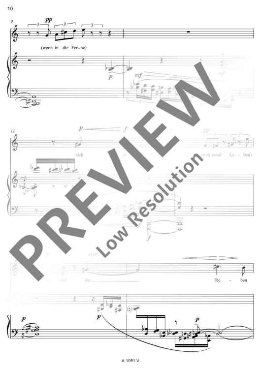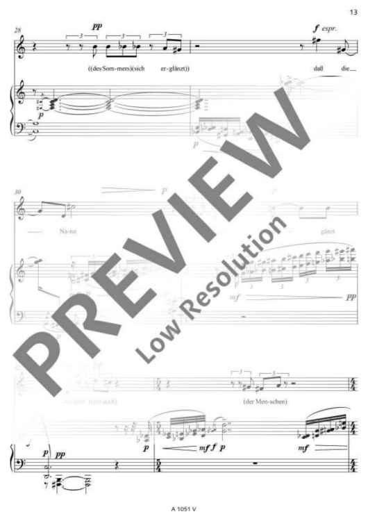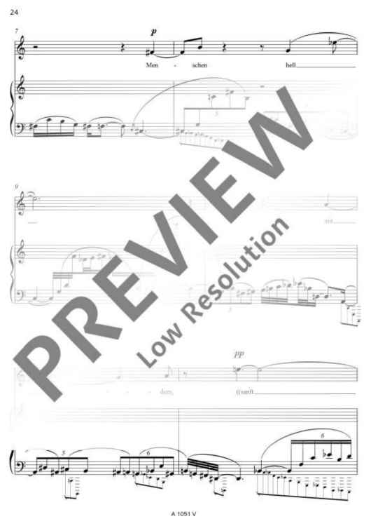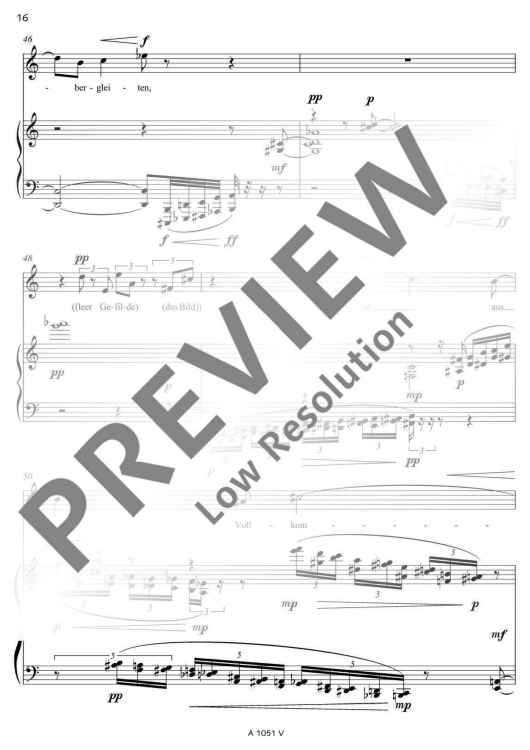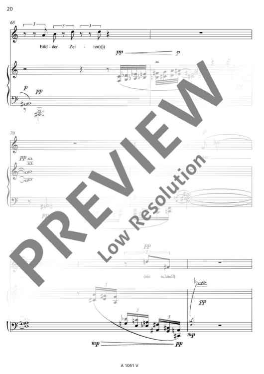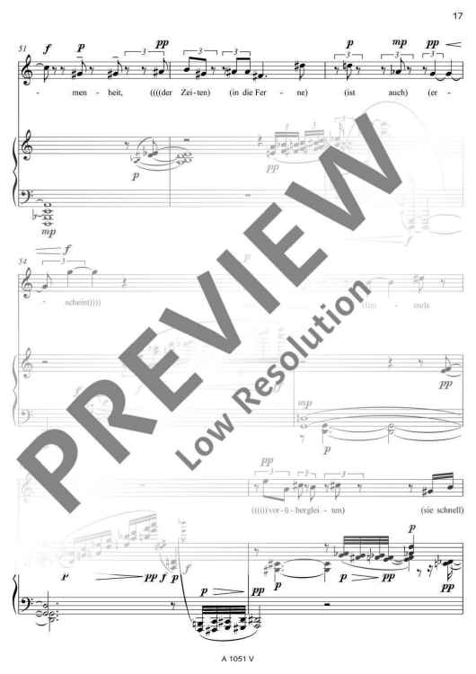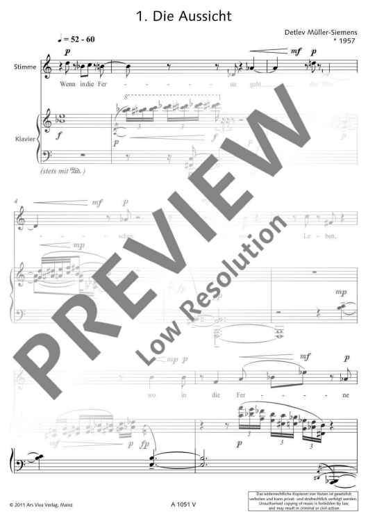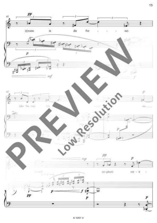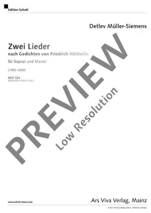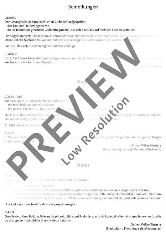 Two poems of Friedrich Hölderlin bearing almost the same title form the basis of the text for 'Zwei Lieder' (Two Songs): 'Die Aussicht' and 'Aussicht'. Unlike as with common musical settings of poems, Detlev Müller-Siemens has split the vocal part in two levels. On the one hand, Hölderlin's text is recited, on the other hand, fragments of the poems are sung at a lower, contemplative level. 'Like vague memories, ascending from the inside from afar. An idyll that becomes entangled in its own images.'