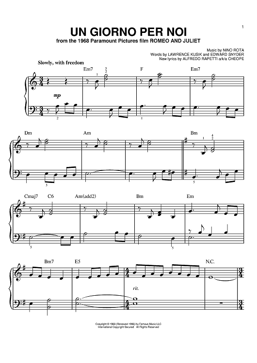 Digital Sheet Music for Un Giorno Per Noi by Nino Rota, Larry Kusik, Josh Groban, Alfredo Rapetti, Edward Snyder scored for Easy Piano; id:397913
