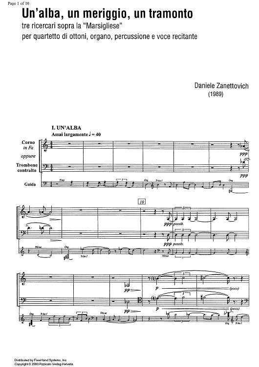 Digital Sheet Music for Un'alba, un meriggio, un tramento - French Horn in F/Alto Trombone by Daniele Zanettovich scored for Brass Quartet/Organ/Percussion/Narrator; id:345126
