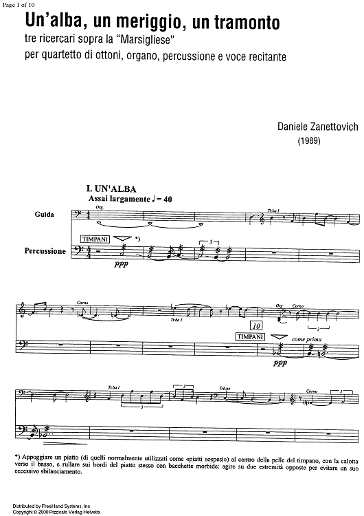 Digital Sheet Music for Un'alba, un meriggio, un tramento - Percussion by Daniele Zanettovich scored for Brass Quartet/Organ/Percussion/Narrator; id:345129