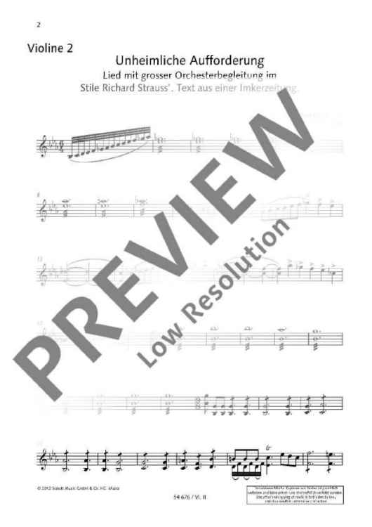 In addition to the two magnificent string quartet parodies 'Repertorium für Militärmusik "Minimax"' [Repertory for military music 'Minimax'] (ED 6735) and 'Ouvertüre zum "Fliegenden Holländer", wie sie eine schlechte Kurkapelle morgens um 7 am Brunnen vom Blatt spielt' [Overture of 'The Flying Dutchman' as played at sight by a bad spa orchestra at the well at 7 in the morning] (ED 8106), 'Uncanny Invitation' is another merry work by Paul Hindemith, a 'Song with Full Orchestra Accompaniment in the Style of Richard Strauss. Text taken from a Beekeeper’s Journal. For soprano and quartet. Strauss' song 'Heimliche Aufforderung' [Secret Invitation] probably was behind the corruption of the title. The text, slightly changed by Hindemith, from the magazine 'Die Biene und ihre Zucht' [Bees and how to keep them] from 1924 inspired Hindemith to make this creation, provided with the invitation 'am Bienenstand (d. h. an der Donauquelle) … jung zu baden' [to bathe young … at the apiary (i.e. at the source of the Danube)], to not let oneself be carried away by the ageing Strauss, but by contemporary music.