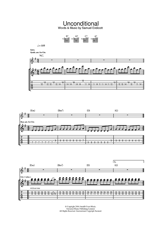Digital Sheet Music for Unconditional by The Bravery, Samuel Endicott scored for Guitar Tab; id:386388