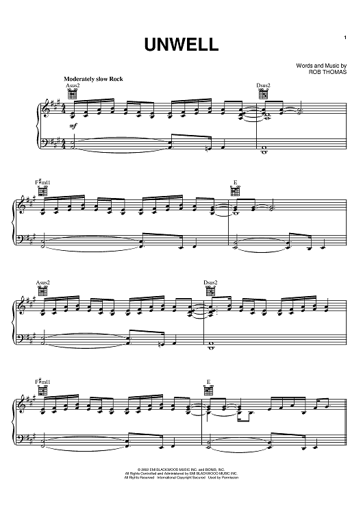 Digital Sheet Music for Unwell by Matchbox Twenty, Rob Thomas scored for Piano/Vocal/Chords; id:371537