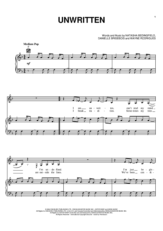 "Unwritten" Sheet Music by Natasha Bedingfield