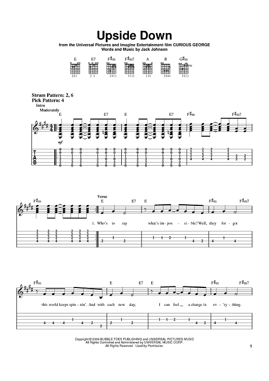 Digital Sheet Music for Upside Down by Jack Johnson scored for Easy Guitar Tab; id:396104