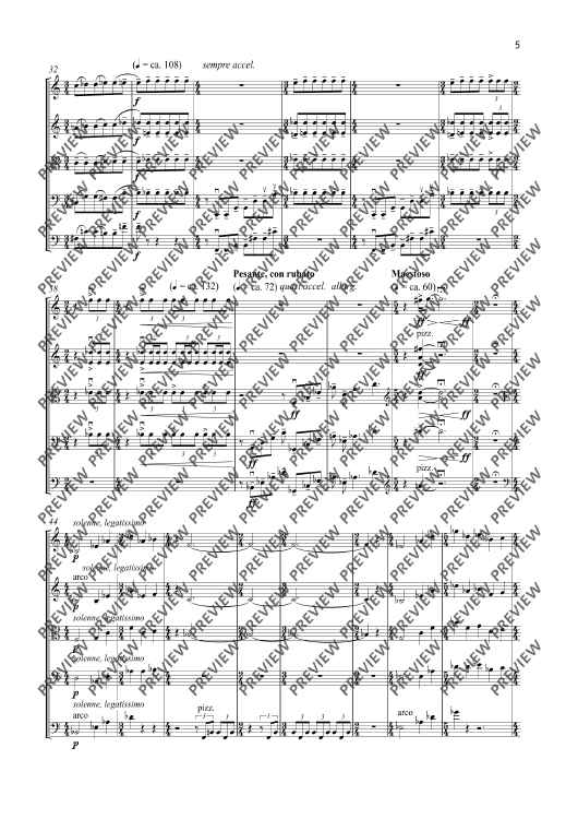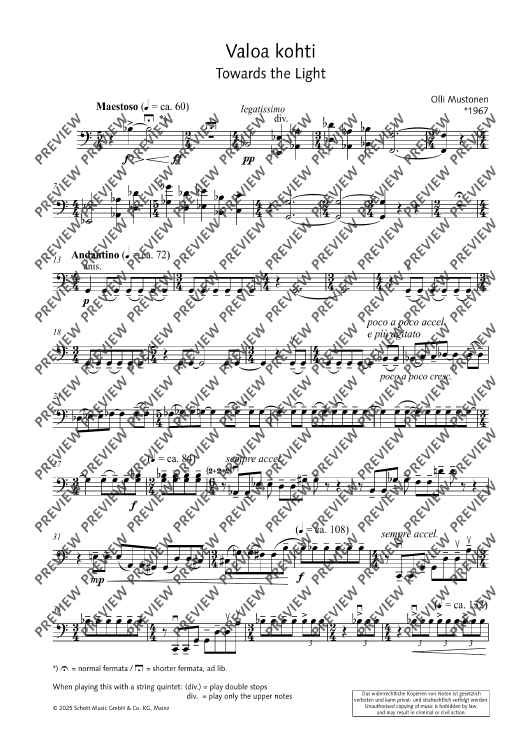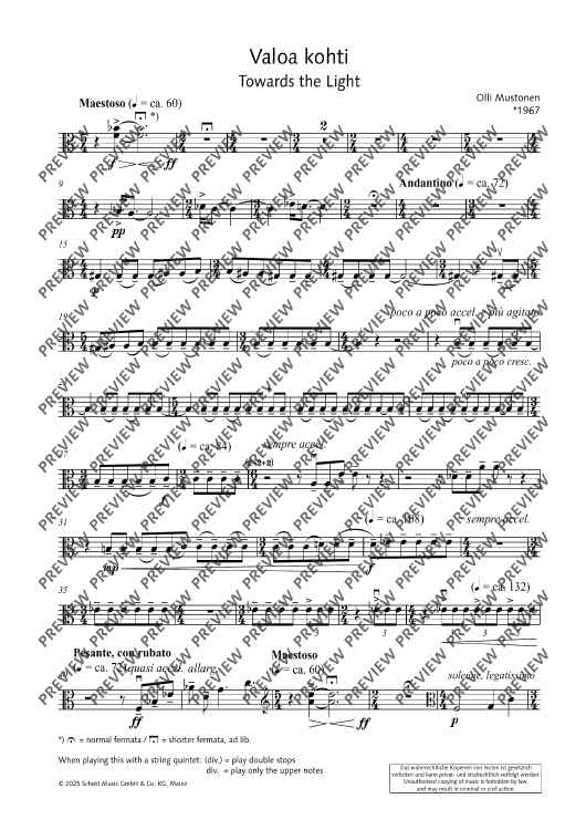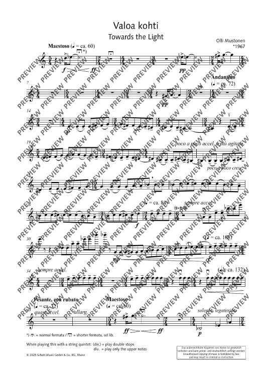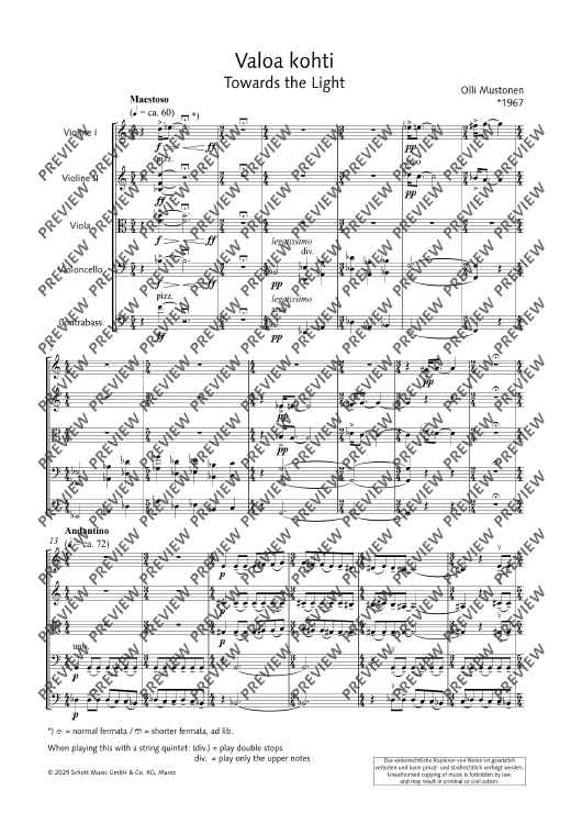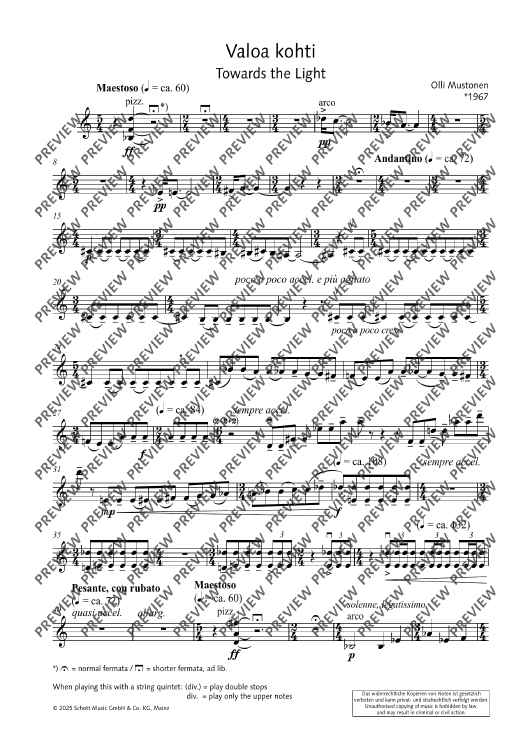 Digital Sheet Music for Valoa kohti (Towards the Light) - Score and Parts by Olli Mustonen scored for 2 Violins, Viola, Cello And Double Bass; id:508057