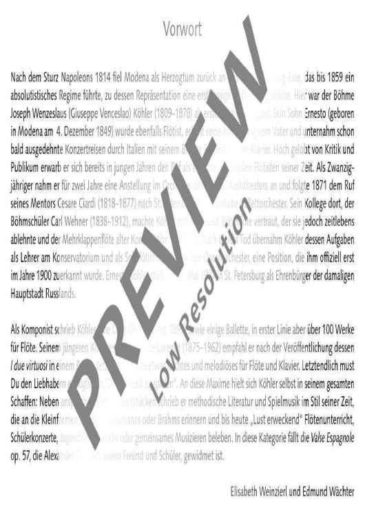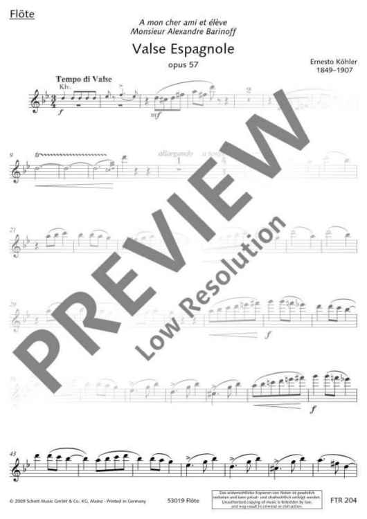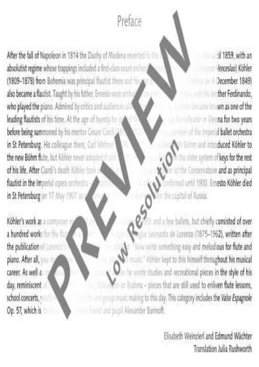 Neben anspruchsvollen Konzertstücken schrieb Ernesto Köhler (1849-1907) vor allem methodische Literatur und Spielmusik im romantischen Stil, die an die Kleinformen Chopins, Schumanns oder Brahms erinnern und bis heute ein fester Bestandteil im Flötenunterricht, bei Schülerkonzerten und beim Wettbewerb "Jugend musiziert" sind. In diese Kategorie fällt auch der "Valse Espagnole" op. 57, ein ausdrucksstarkes Charakterstück für Unterricht und Konzert.
