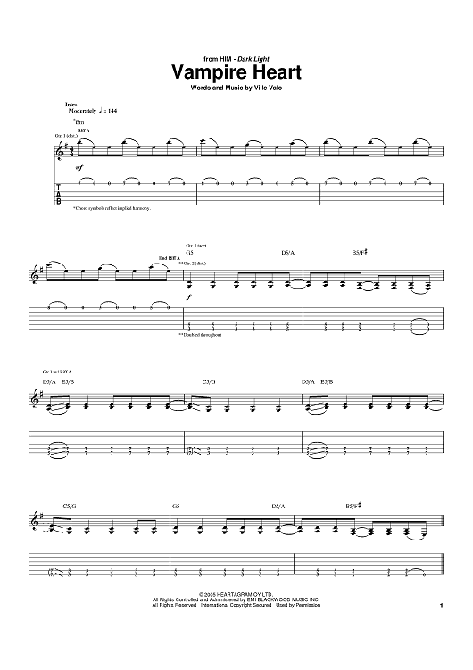 Digital Sheet Music for Vampire Heart by HIM, Ville Valo scored for Guitar Tab; id:393424