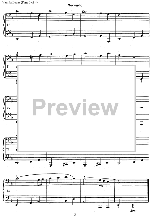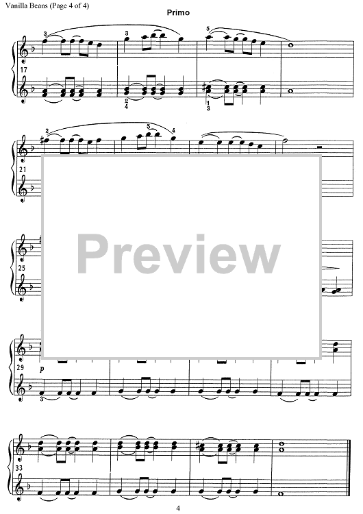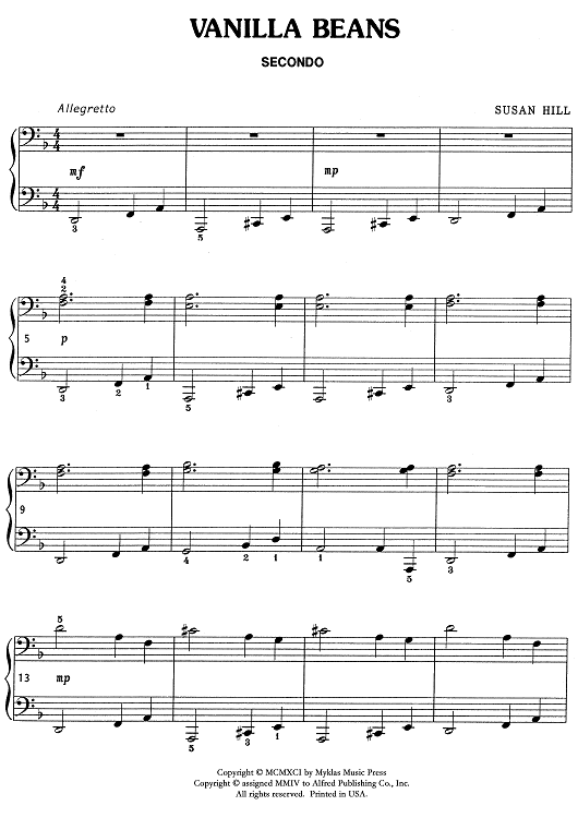 Gentle, Caribbean syncopation makes the primo part fun to play. The rhythmic motifs repeat throughout, making the piece easy to learn, but very musically satisfying. The secondo player's part is composed of half, whole, quarter and dotted quarter notes with no syncopation. This duet provides an opportunity for friends or siblings (who may not be at the same level) to perform together.