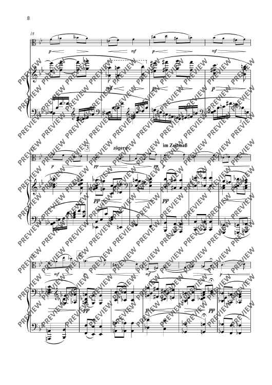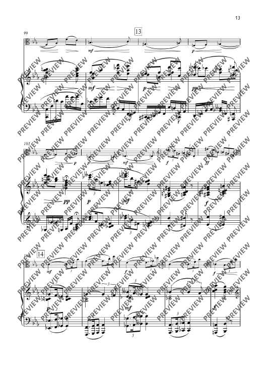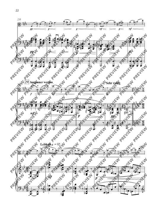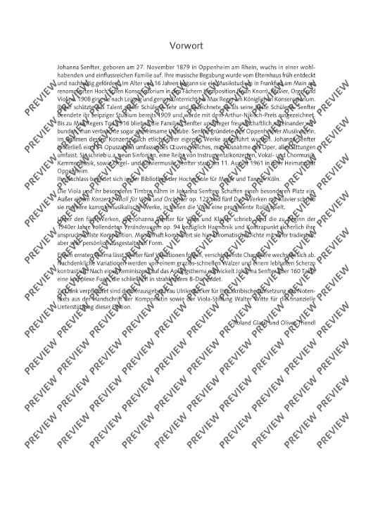 Of the five works that Johanna Senfter wrote for viola and piano, the Variations op. 94, completed at the beginning of the 1940s, are certainly her most sophisticated composition in terms of harmony and counterpoint. Here she expertly combines chromatic density with a traditional but very customised form. Senfter follows a solemn theme with five variations, alternating the most diverse characters. Pensive variations are contrasted by a graceful, fast waltz and a vivid scherzo. After a reminiscence of the opening theme, Johanna Senfter develops a complex fugue over 160 bars, which finally ends in a radiant B flat major.