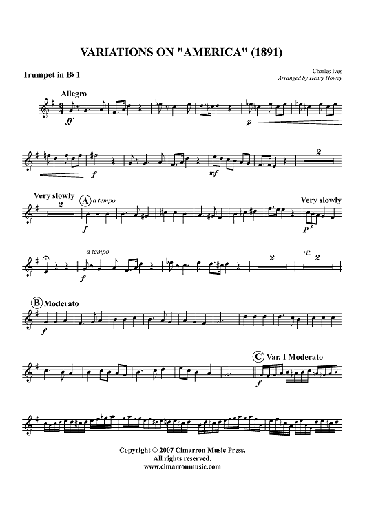 "Variations on "America" - Trumpet 1 in B-flat" Sheet Music by Charles Ives