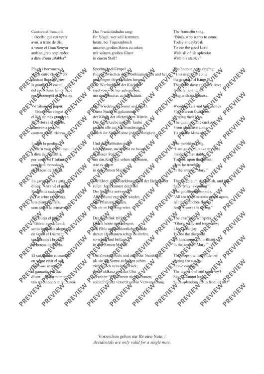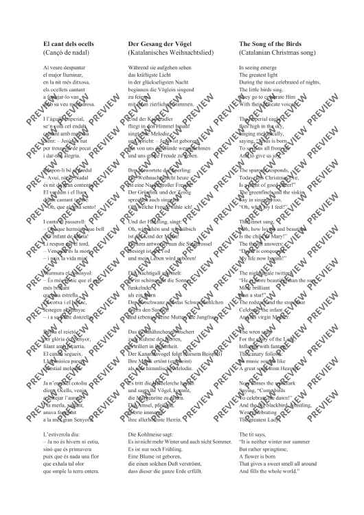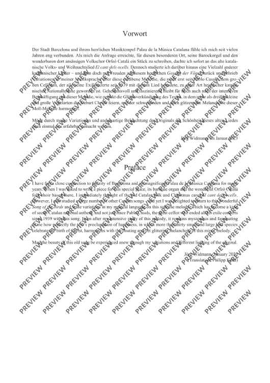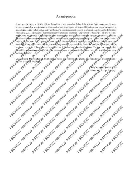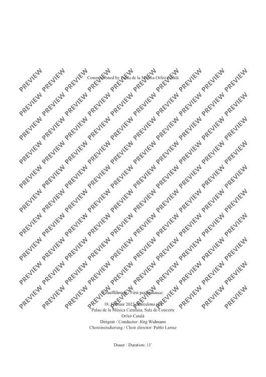 Der Stadt Barcelona und ihrem herrlichen Musiktempel Palau de la Música Catalana fühle ich mich seit vielen Jahren eng verbunden. Als mich die Anfrage erreichte, für diesen besonderen Ort, seine Barockorgel und den wunderbaren dort ansässigen Volkschor Orfeó Català ein Stück zu schreiben, dachte ich sofort an das alte katalanische Volks- und Weihnachtslied ‚El cant dels ocells‘. Dennoch studierte ich darüber hinaus eine Vielzahl anderer katalanischer Lieder – und kam doch mit Freuden zu diesem herrlichen ‚Gesang der Vögel‘ zurück und schrieb Variationen in meiner Musiksprache über diese erhabene Melodie, die nicht erst seit Pablo Casals, dem großen Cellisten, der alle seine Exilkonzerte seit 1939 mit diesem Lied beendete, zu einer Art heimlichen katalanischen Nationalhymne geworden ist. Geheimnisvoll und faszinierend bleibt für mich auch nach der intensiven Beschäftigung mit dieser Melodie, wie perfekt die Glücksverkündigung des Textes, in dem mehr als dreißig kleine und große Vogelarten die Geburt Christi feiern, mit der schwebenden und doch glitzernden Melancholie dieser Moll-Melodie harmoniert. Möge durch meine Variationen und andersartige Beleuchtung des Originals die Schönheit dieses alten Liedes noch einmal neu erfahrbar gemacht werden. - Jörg Widmann, im Januar 2023