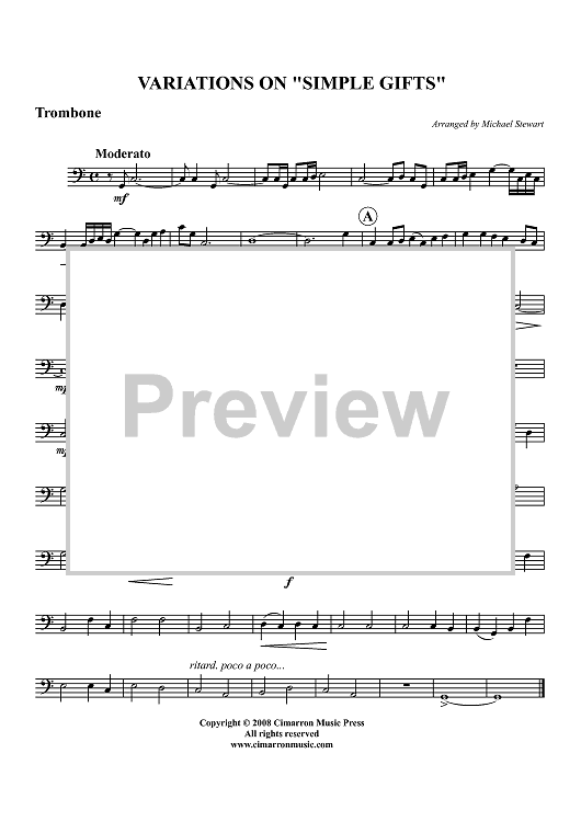Digital Sheet Music for Variations on "Simple Gifts" - Trombone by Michael Stewart, Elder Joseph Brackett scored for Brass Quintet; id:417051