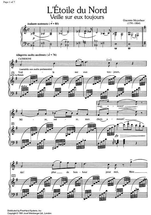 Digital Sheet Music for Veille sur eux toujours from L'Étoile du Nord by Giacomo Meyerbeer scored for Soprano/Piano; id:332346