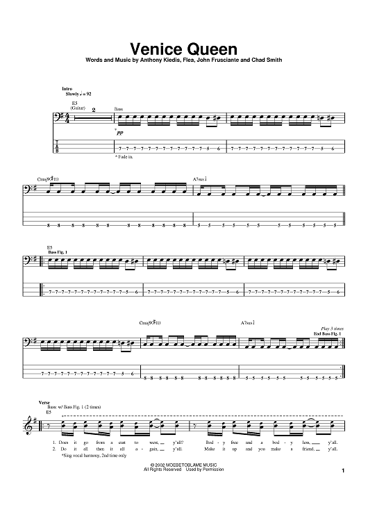Digital Sheet Music for Venice Queen by Flea, John Frusciante, Anthony Kiedis, Red Hot Chili Peppers scored for Bass Tab; id:372159