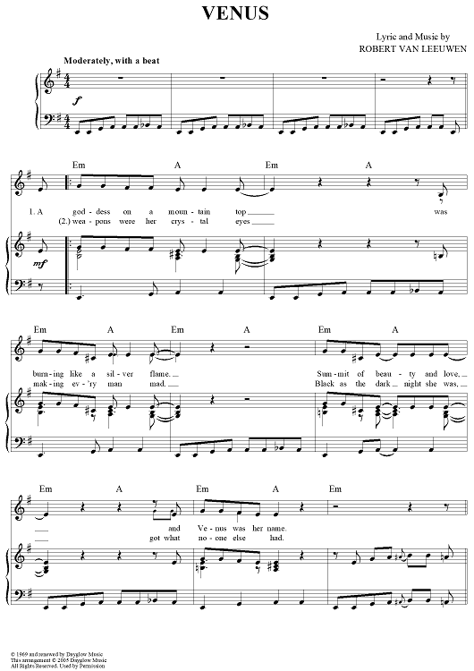 Digital Sheet Music for Venus by Bananarama, Robert Van Leeuwen, Shocking Blue scored for Piano/Vocal/Chords; id:315284
