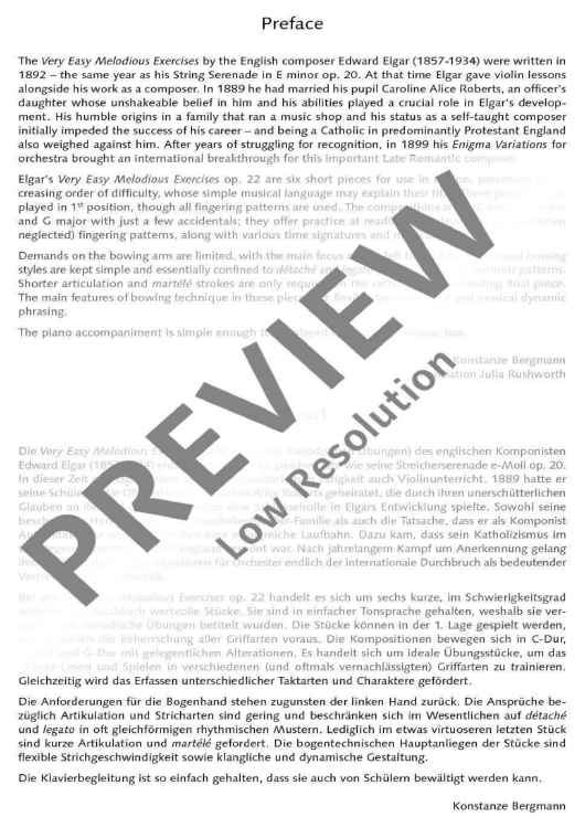 Mostly remembered for his great compositions, during his life Edward Elgar was also a violin teacher. These six short studies, presented in a progressive order of didactic difficulty, are, despite their simplicity, very musical. They can be played in the first position, but require the knowledge of all fingering patterns. The compositions are set in C major, A minor and G major with occasional modulations. They are ideal practice-pieces to encourage confident reading and playing in various (and often neglected) fingering patterns. At the same time, they promote the understanding of different metres and characters. This edition is part of the new Schott Student Edition series which offers varied literature at five different levels of difficulty, from 1 (easy) to 5 (difficult), for instrumental lessons: In print or electronic format Available as printed editions or PDF download Practising – efficiently and with pleasure: Accompanying tracks of the pieces available as downloads
