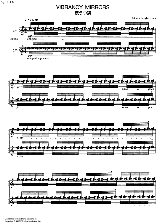 Digital Sheet Music for Vibrancy Mirrors by , Akira Nishimura scored for 2 Pianos; id:337442