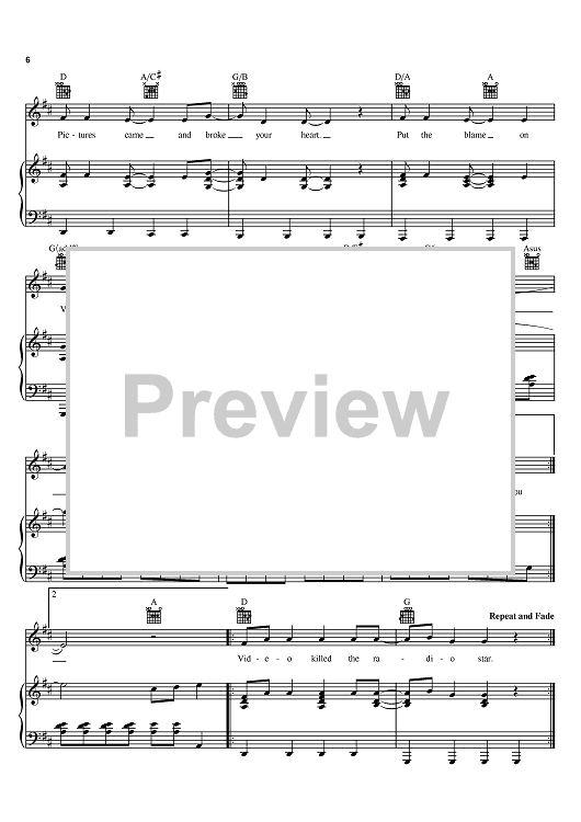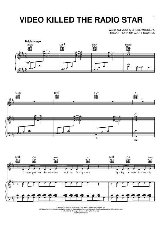 Digital Sheet Music for Video Killed The Radio Star by Trevor Horn, Geoff Downes, Asia, The Buggles, Erasure, Bruce Woolley scored for Piano/Vocal/Chords; id:381344