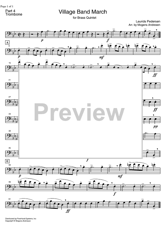 Digital Sheet Music for Village Band March - Trombone by Mogens Andresen, Laurids Pedersen scored for Brass Quintet; id:328318
